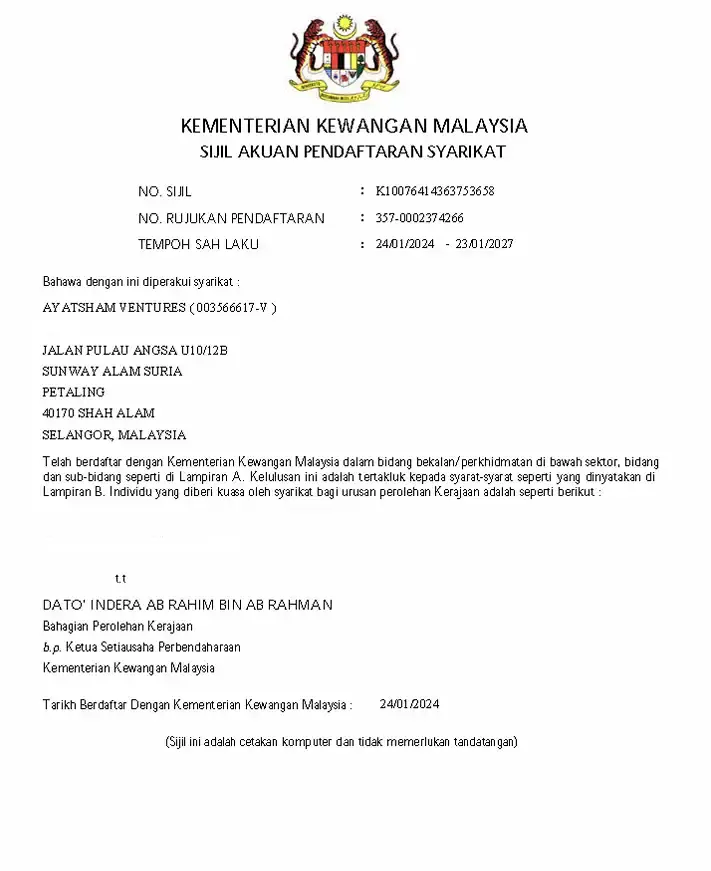 AYATSHAM VENTURES is wholly owned by Bumiputera and registered with the Ministry of Finance (MOF) and Construction Industry Development Board (CIDB).